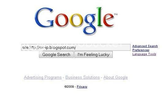 Untuk memeriksa apakah blog Anda telah diindeks oleh Google atau tidak anda harus masuk ke halaman pencarian Google. Kemudian pada form pencarian ketikkan kata kunci "situs: http:// yoursite.com". Yang harus anda lakukan adalah mengganti "yoursite.com" dengan URL blog Anda sendiri. Dalam contoh kali ini saya memasukkan kata kunci "site:http://mr-ip.blogspot.com". Kemudian klik tombol Search. Untuk gambarannya seperti pada gambar berikut ini.